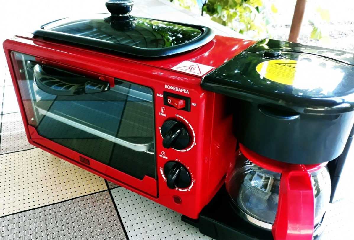 Этот необычный агрегат способен порадовать вас горячими бутербродами и свежесваренным кофе одновременно. Печка достаточно небольшая (7 л), поддерживает только один режим нагрева верх+низ. Максимальная температура — 230 °C, имеется таймер. Помимо кофеварки, печка имеет открытую поверхность для гриля сверху. В комплектации — решётка, а также маленький противень для поджарки тостов. Идеальный ростер для приготовления горячих завтраков на всю семью: горячие бутерброды, яичница, жареные сосиски — а также качественный кофе, как из кофемашины.