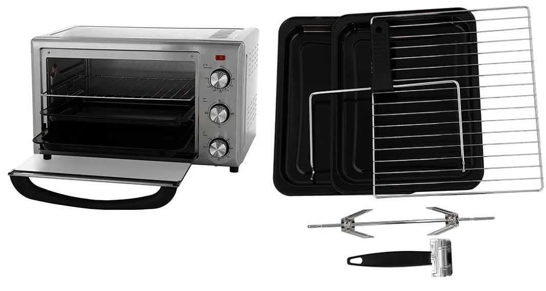 Мини-печка устойчива, ножки прорезинены. В комплект входит решетка, противень, вертел и поддон для крошек. Единственный недостаток, который отметили пользователи — неприятный запах из печи при нагреве в первое время.