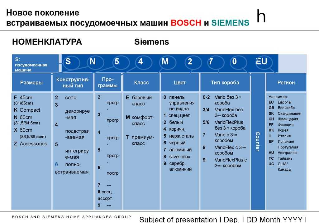 В названии посудомоечной машины заложены ее базовые параметры. Маркировка состоит из букв и цифр. Буквы указывают на тип и конструктивные особенности. Самая первая «S» обозначает посудомойку.