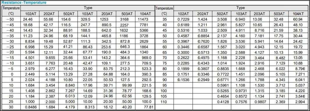 Поиск спецификации (specification, datasheet) обычно проводится по зарубежным источникам, в PDF файле техдокументации указаны все характеристики терморезистора. По таблице видим, что сопротивление составляет 5 кОм при +25° C, рабочий диапазон от −50 до +110° C.