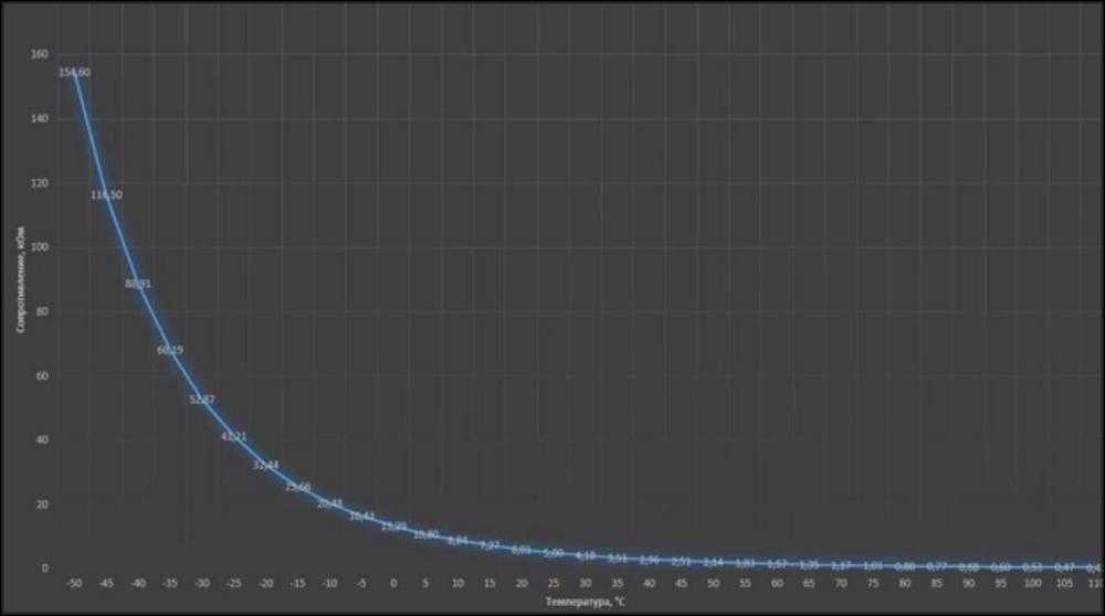 Далее, смотрим по графику, как меняется сопротивление в процессе роста/понижения температуры. Чем она выше, тем ниже число Ом и наоборот.