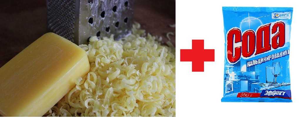 Натрите на крупной терке один кусок хозяйственного или детского мыла. Залейте стружку одним литром кипятка. После в растворенную в воде массу добавьте кальцинированную соду (50 гр.). Все тщательно перемешайте вручную или блендером. Получившееся средство можно перелить в бутылку с крышкой.