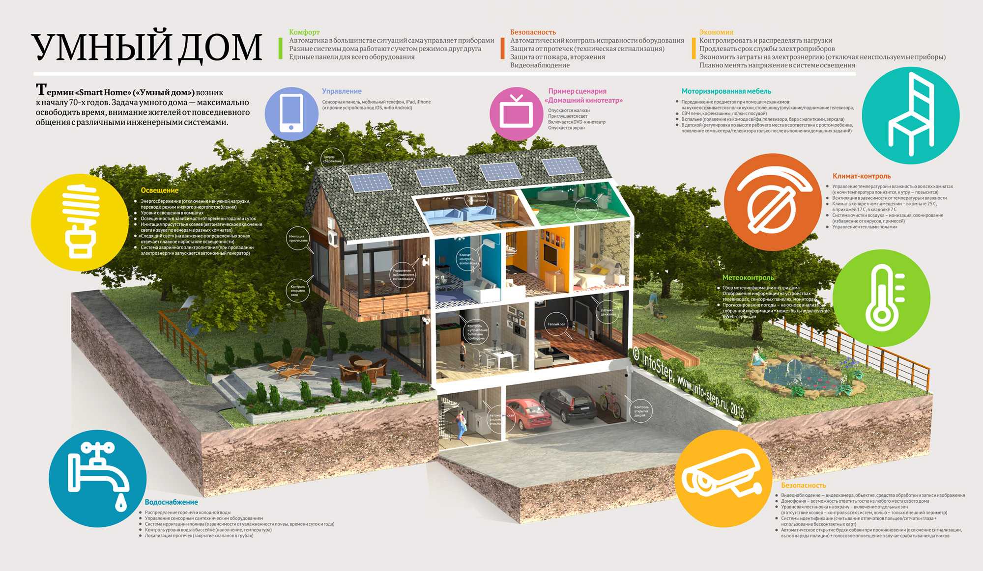 Иными словами эта технология представляет собой систему домашней автоматизации. Это набор электроприборов, которые способны самостоятельно принимать решения и осуществлять монотонные ежедневные домашние обязанности. В целом умные системы управления являются набором огромного количества технологий, которые можно совмещать исходя из потребностей жильцов дома. Площадь и число пользователей также влияют на выбор концепции Smart Home. Для частного дома актуальны умные автоматические ворота и двери, тогда как для отдельно взятой квартиры модули с микроконтроллерами встраиваются в мультиварки, осветительные и другие бытовые электроприборы.