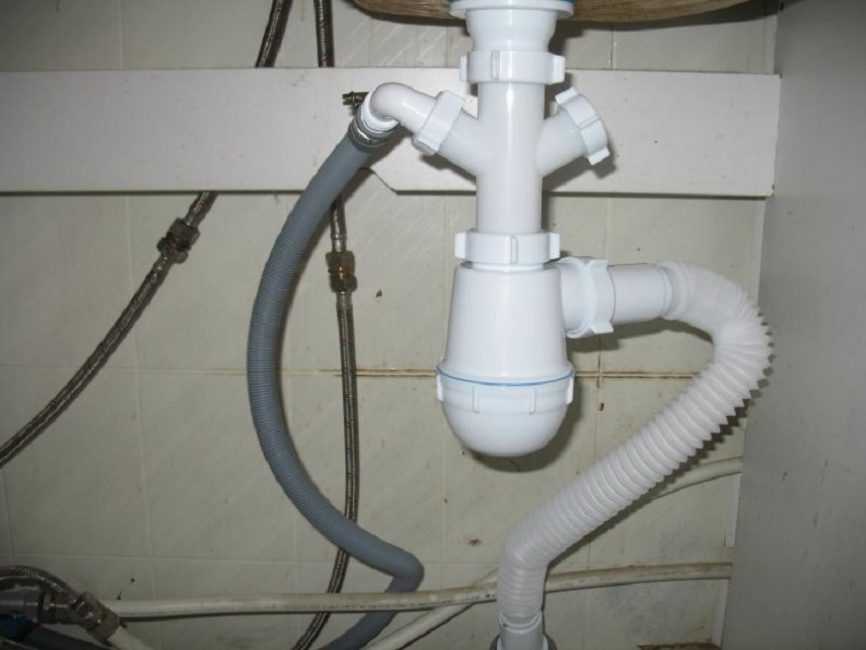 В конструкции подобного сифона предусмотрено место для подключения дополнительного сливного шланга. Иногда подобных отведений бывает несколько.