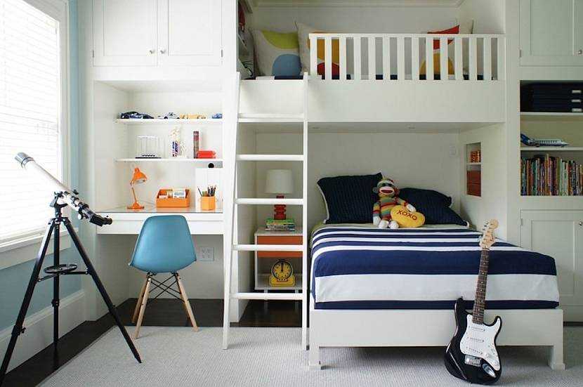 Можно создать двухъярусную комнату, где спальня располагается наверху. Однако это практически невозможно для хозяев современных тесных квартир, поэтому чаще выбирают двухъярусную кровать, которая позволяет сэкономить много места. Можно использовать раскладной диван или кресла.