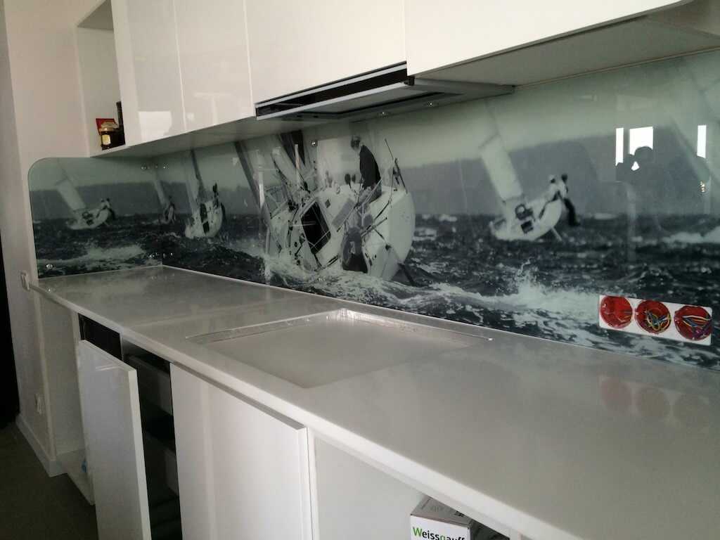 триплекс (многослойное стекло) – это очень надежный и долговечный вариант. Между двух стеклянных панелей запечатывают изображение, получая, таким образом, прочный и надежный фартук, которому не страшны никакие воздействия. Очень удобно, что триплекс не разбивается, а в случае сильного удара просто трескается. Но есть у такого решения и недостатки – фартук получается куда толще и тяжелее всех прочих вариантов;