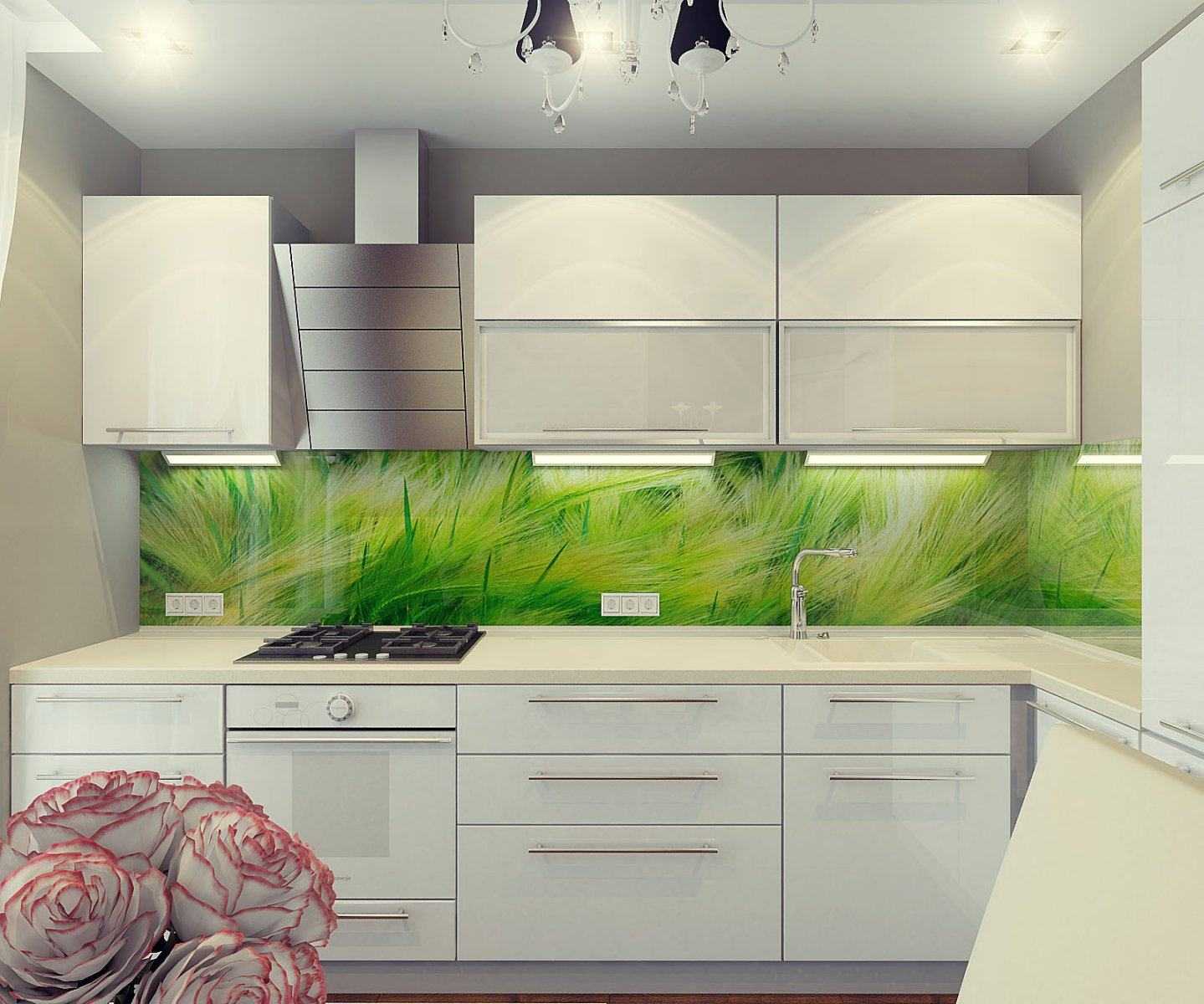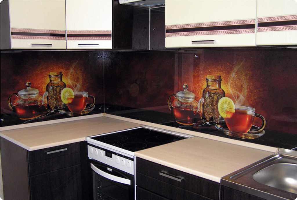 Дизайнеры предлагают сосредоточиться на фотографиях под скинали из стекла в горизонтальной рамке. Водные мотивы хорошо смотрятся на кухонных панелях. Капли росы на зеленой траве, разноцветные фрукты, плавающие в воде, коралловый риф и красиво окрашенные рыбки. Стеклянную панель можно разделить на меньшие фрагменты, таким образом, даже большие поверхности стен могут быть покрыты. Нежные веточки лаванды будут отлично смотреться на стеклянной панели в провансальских кухнях. Для любителей суши предлагаются декорации в японском стиле с бамбуковыми мотивами на стеклянной поверхности, нежными цветами лотоса, которые так часто используются для оформления украшений в восточном пространстве. Темы, связанные с кофе, чайной церемонией, уже стали классикой.
