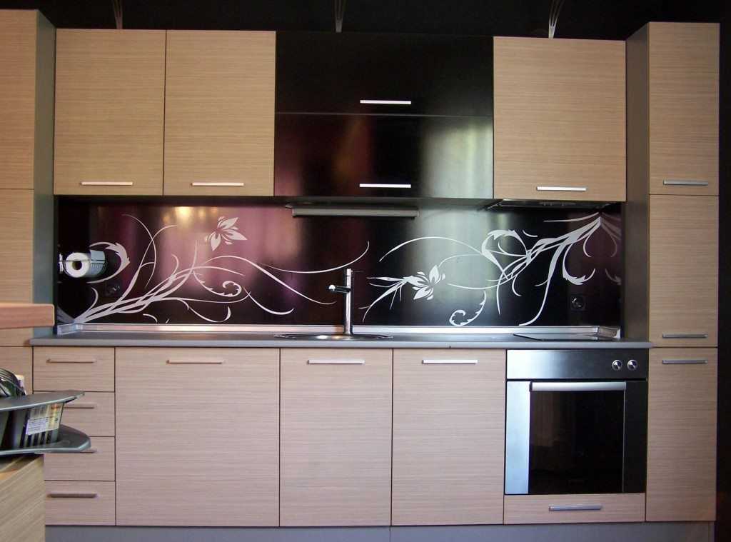 стеклянные панели на кухню с рисунком на виниловой пленке. В отличие от фотопечати, этот способ не отличается долговечностью. Декоративную пленку наклеивают на обратную сторону стекла, которое в данном случае выступает защитой от загрязнений и влаги. Однако, в процессе эксплуатации, пленка нередко деформируется, хотя нельзя не признать, что фото фартука из стекла на кухню, отлично демонстрируют привлекательность этого варианта;