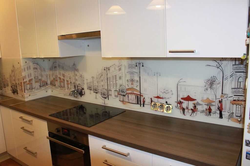 стекло с фотопечатью – это самый популярный вид на сегодняшний день. Очень часто их еще называют скинали. Фото-примеры отлично демонстрируют, насколько эффектно смотрятся такие панели, и как велико их разнообразие. Технология нанесения рисунка заключается в использовании УФ-чернил, при помощи которых на обратную сторону стекла наносят изображение. К преимуществам такого решения можно отнести тот факт, что рисунок получается чрезвычайно устойчивым к воздействию влаги и солнечных лучей, но и стоит такое стекло несколько дороже, чем бесцветное или просто окрашенное стекло;