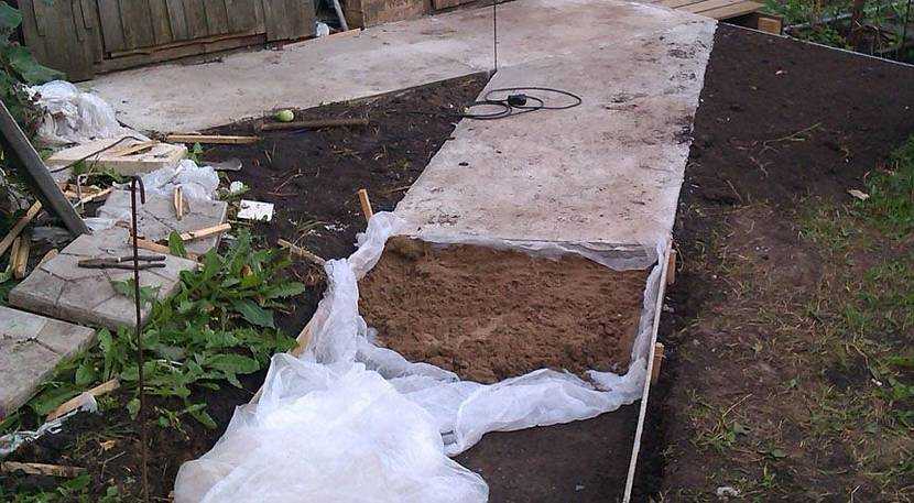 Если участок под дорожку влажный, то обустраивают подушку. Глубина вырытой траншеи – 100 мм. На дно котлована укладывают нетканое волокно (геотекстиль, рубероид), которое не дает раствору с жидкостью уходить в землю. Вначале добавляют слой гравия, потом насыпают песок. Сырье равняют и уплотняют, тщательно проливают водой, по бокам монтируют бордюры.