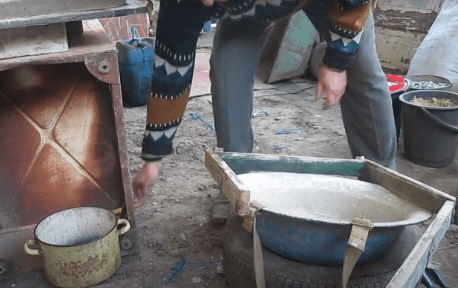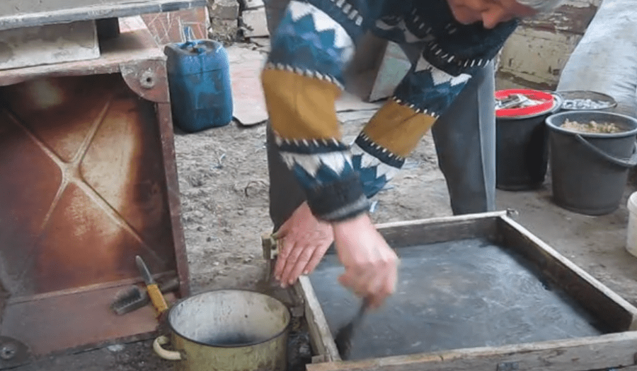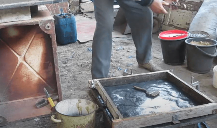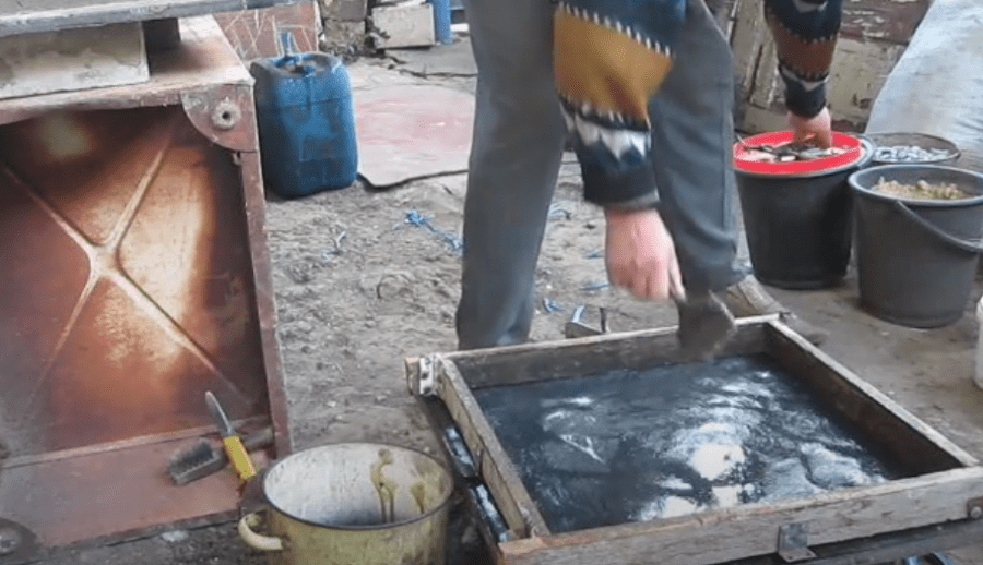Через несколько минут выдавленные вибрацией из раствора воздух и вода покажутся на поверхности в виде белой пенки. В этот момент вибростол выключают, снимают формы и устанавливают их на стеллаж.