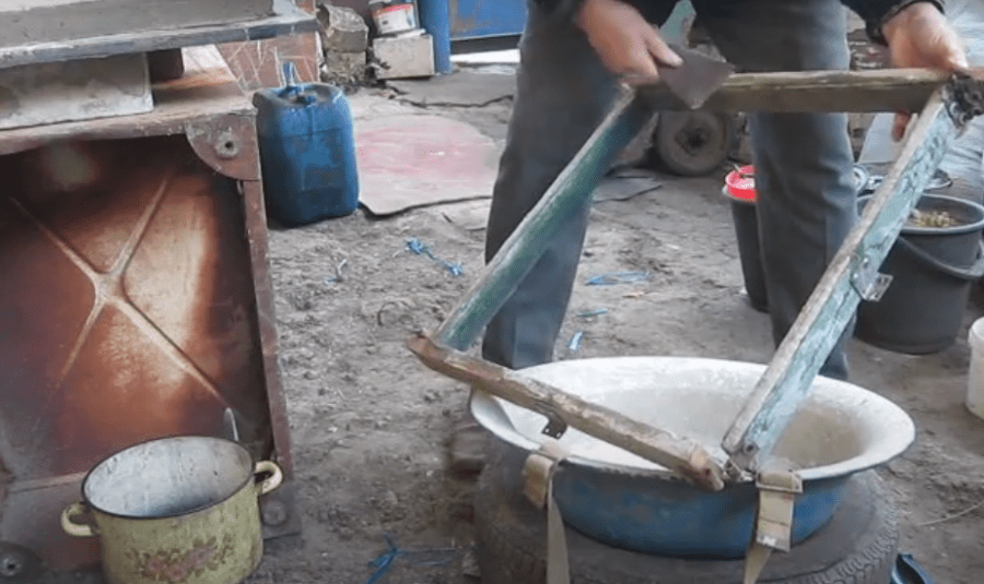 - Для устройства механического надавливания применяются шестерёнки и профильная труба в качестве рычага. Чем длиннее рукоятка, тем сильнее нажатие будет на смесь. Сюда же крепится пружина для возврата пресса в исходное положение.