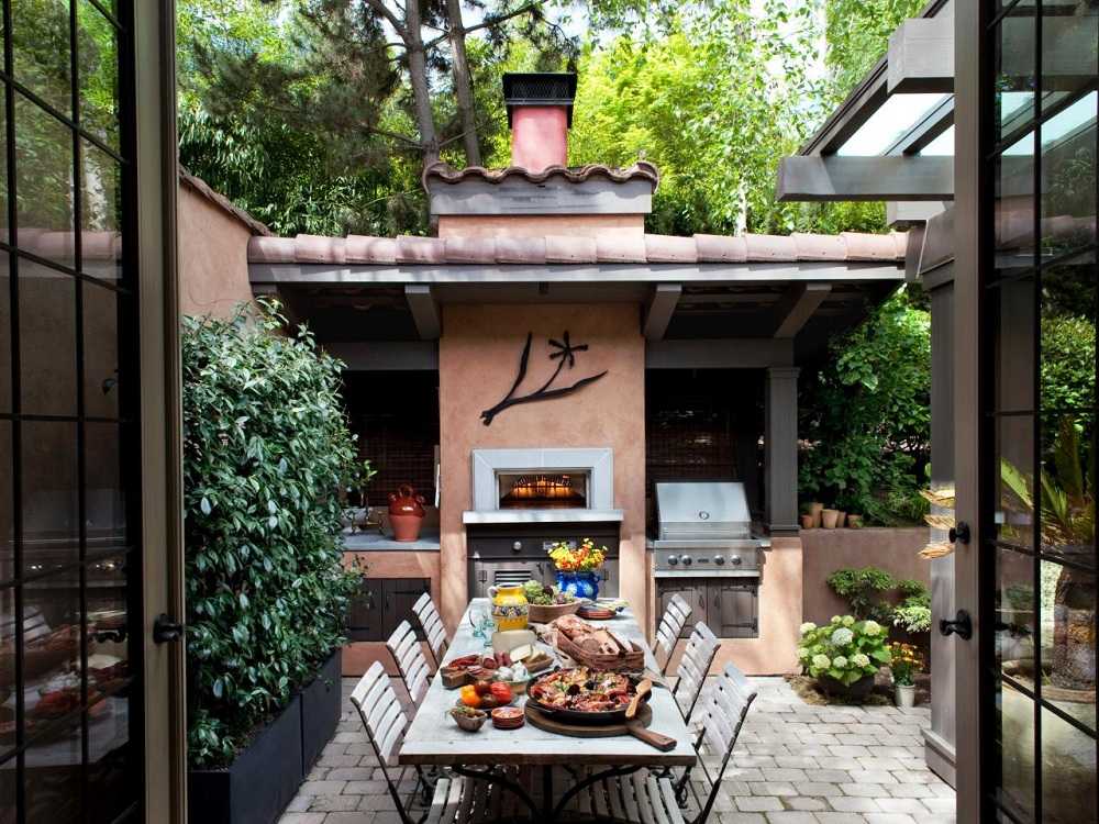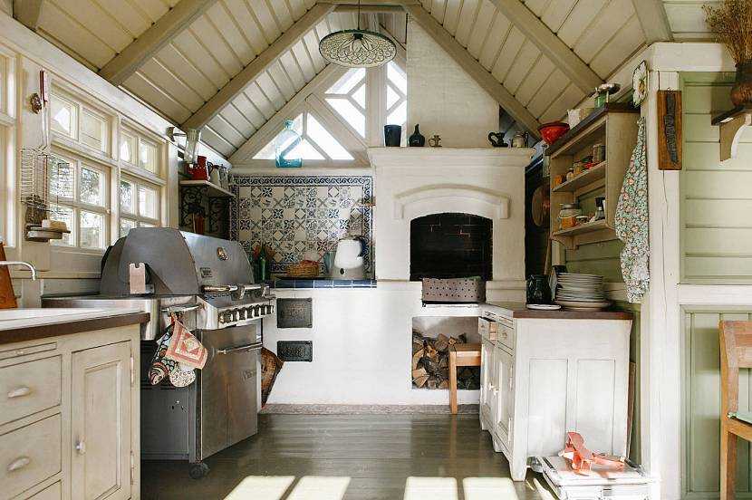 - на такой кухне обычно располагают барбекюшницу или мангал.