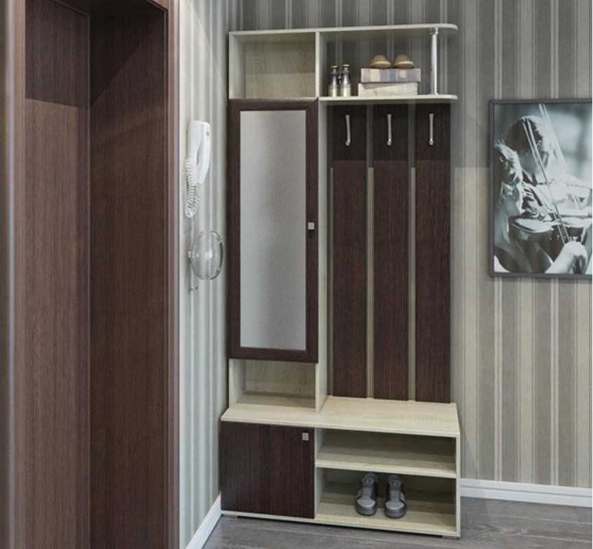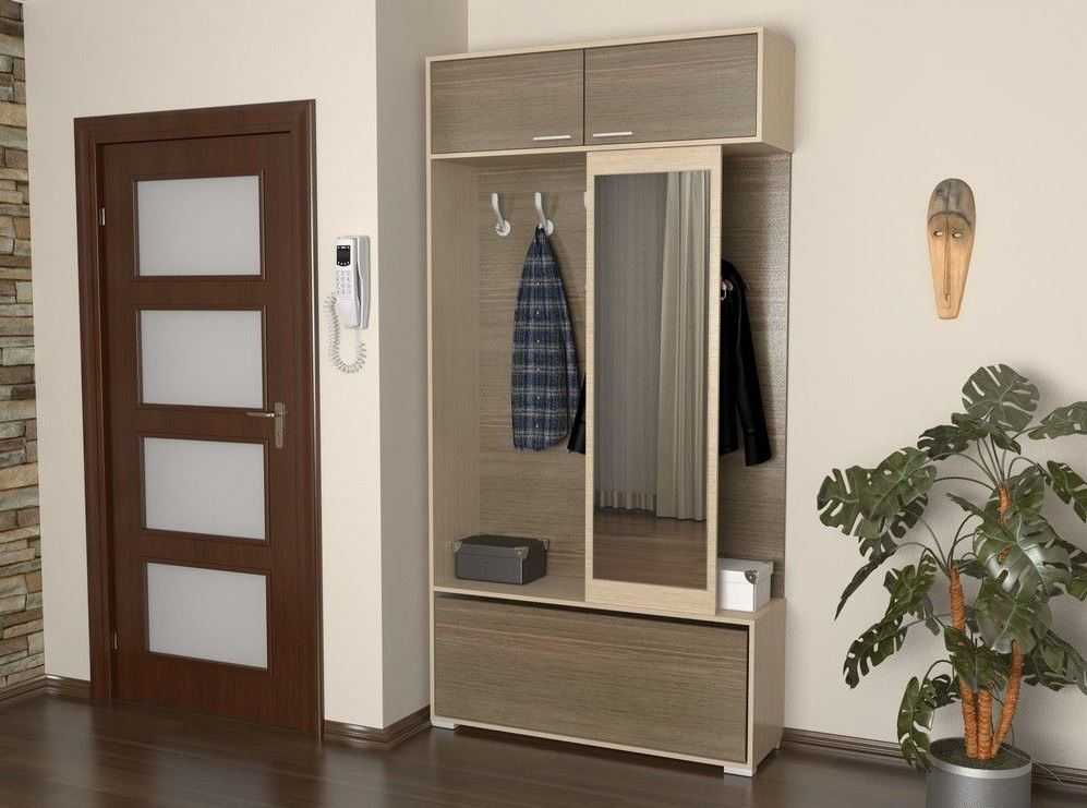 Уходя всегда удобно бегло осмотреть себя, поэтому зеркало. Обувь удобнее одевать сидя, а под сидушкой иметь открытое место для её хранения