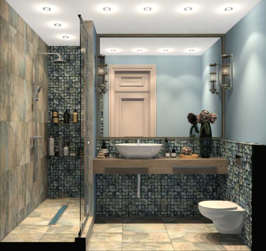 - Органично смотрится несколько типов освещения, включаемых отдельно. Самый яркий свет организуйте рядом с умывальником, так, чтобы он освещал лицо, а не резал глаза.