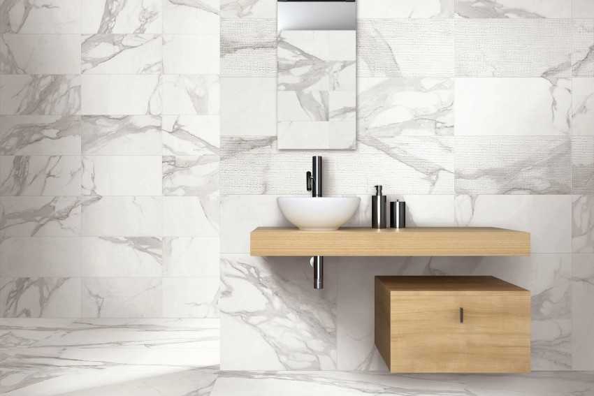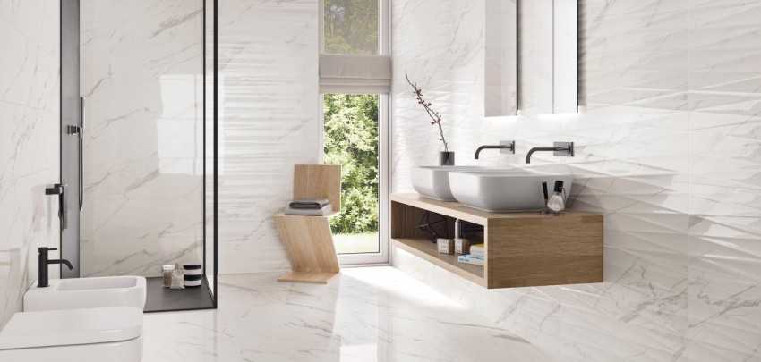 Использование элементов с выпуклым рельефом, особенно моделей с 3D-эффектом создают предельный эффект расширения, но только при декорировании небольших участков стены. Рельефный кафель на всей поверхности вызовет противоположную реакцию.