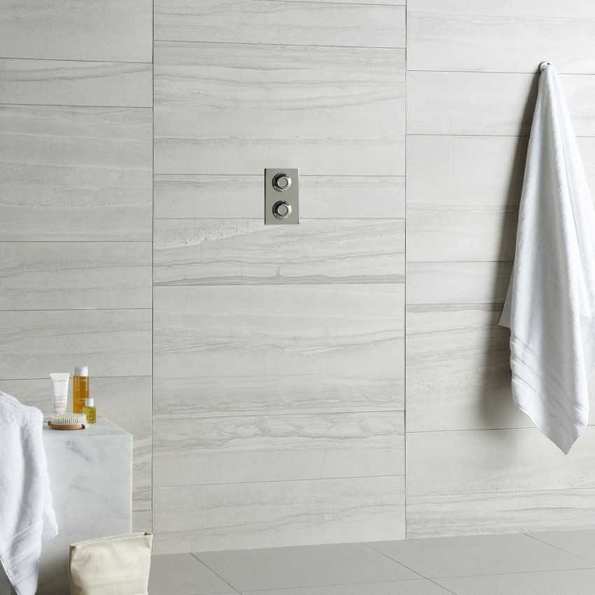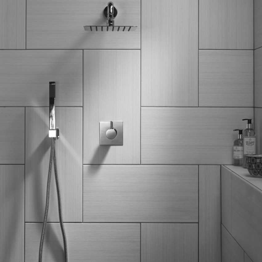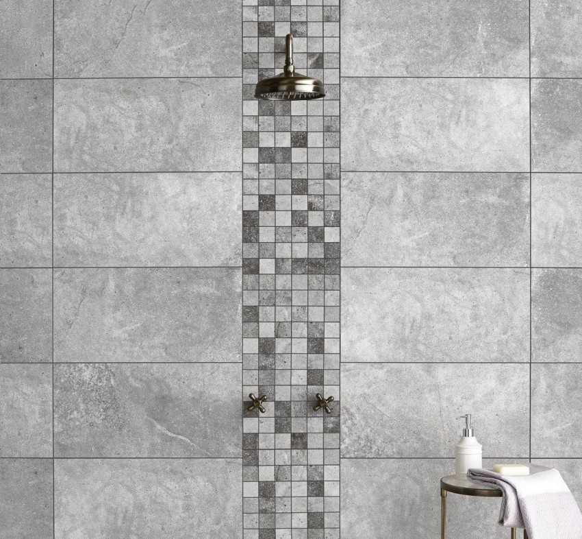 Оформление душевой кабины плиткой с акцентами. Сочетание двух фактур и обыгрывание ниши.