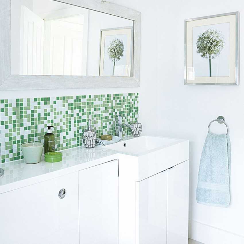 7Использование фоновой плитки двух светлых цветов с мозаикой сходной гаммы объединяет маленькую площадь, нейтрализуя загроможденность.
