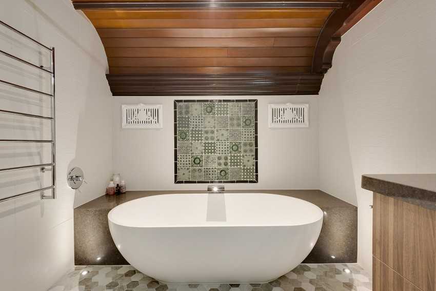 Ванная в стиле шале. Обилие плитки сглаживается оформлением потолка.