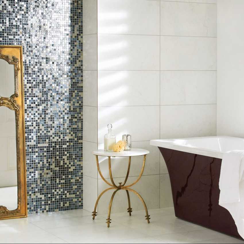 Мелкоформатную мозаику монтировать несколько сложнее, чем плитку обычных размеров. Такую работу предпочтительнее поручить квалифицированному мастеру. Для крепления надо использовать специальный клеевой состав, который наносится более тонким слоем. Чтобы не играться с каждым маленьким квадратиком по отдельности их точечно соединяют клеем на подложку. Когда мозаика зафиксирована на стене ванной комнаты, подложка временно остается на месте. Снимать ее можно только после окончательного высыхания клеящей смеси.
