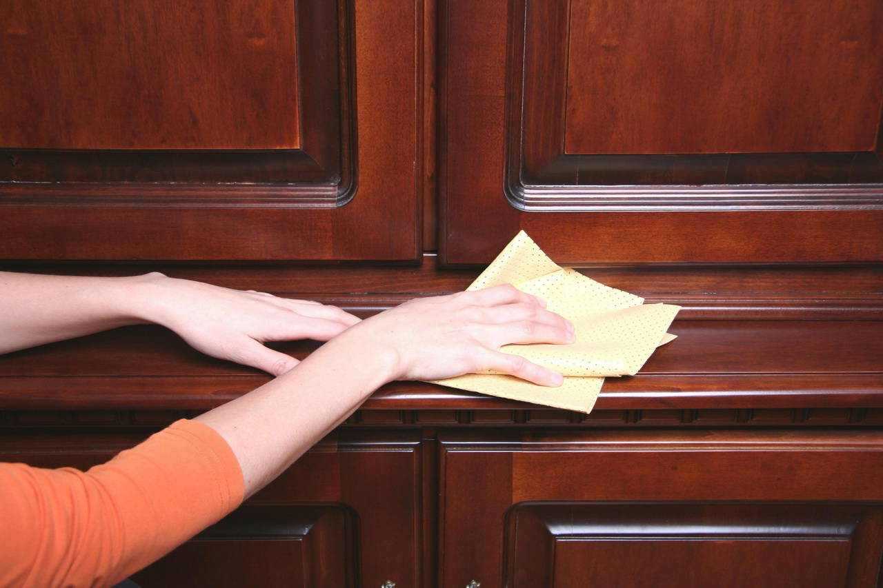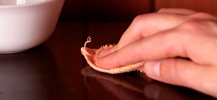 Смешав раствор, следует нанести на поверхность смесь и потереть ее старой зубной щеткой. После нескольких минут необходимо протереть шкаф или стол с помощью фланелевой салфетки.