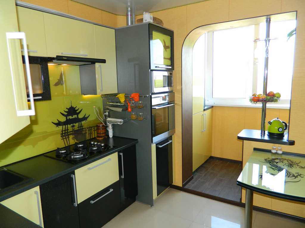 - Чтобы немного расширить помещение кухни, ее можно соединить с балконом;