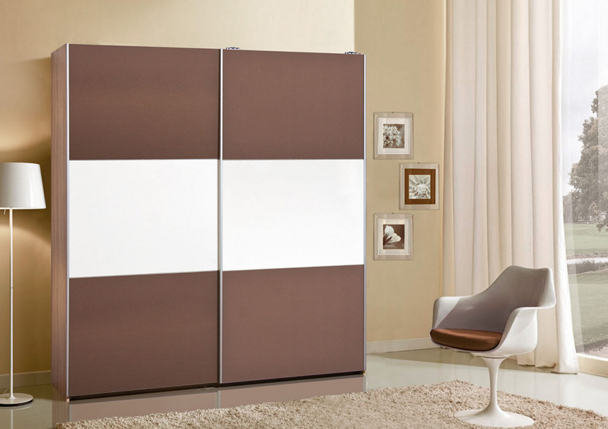 Двустворчатый шкаф с раздвижными дверями, декорированными зеркальным полотном, на сегодняшний день — одна из самых популярных моделей. Для удобства использования зеркало может располагаться только на одной из створок шкафа. Полностью зеркальным может быть весь фасад шкафа. Для придания простому зеркальному стеклу изысканного вида в мебельном производстве применяется специальная технология обработки поверхности путем нанесения пескоструйной печати.