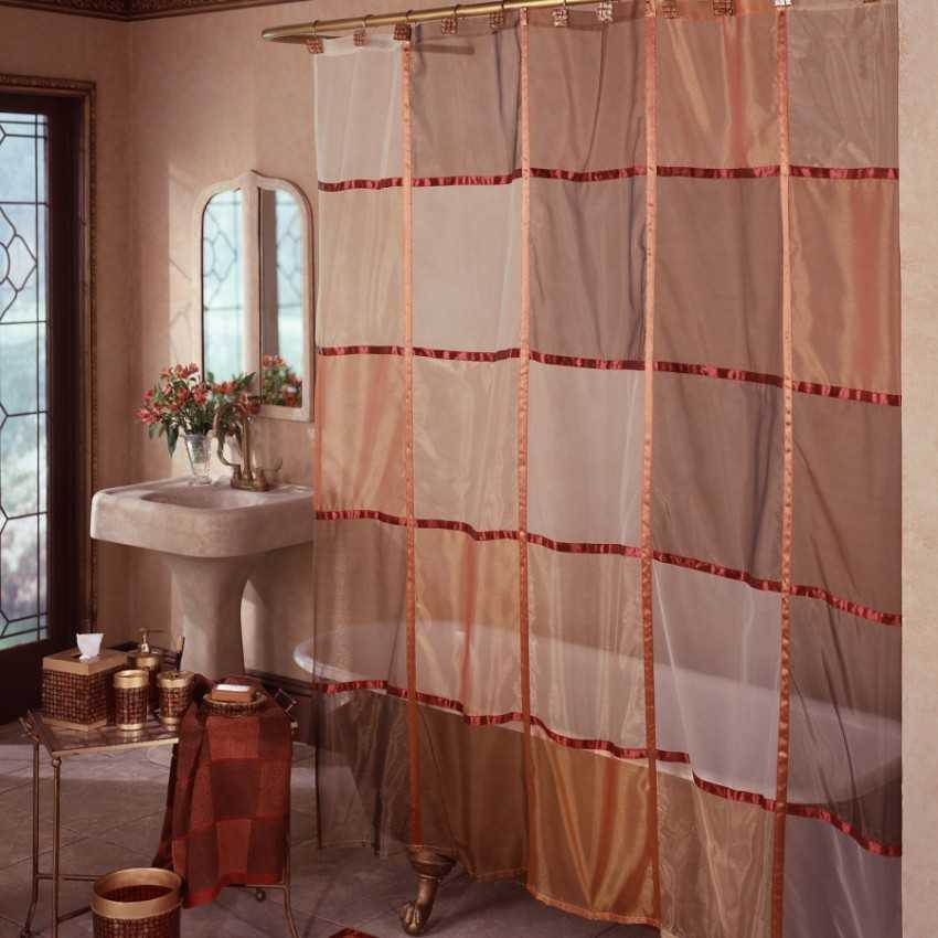 Определившись с моделью штанги, приступают к выбору шторы. Пластиковые карнизы выдержат легкие виниловые занавески, а металлические штанги можно нагрузить и тяжелыми матерчатыми шторами. В просторных ванных комнатах дизайнеры даже комбинируют несколько видов штор, создавая необычный интерьер с помощью драпировки и других приемов оформления тканевых материалов. В любом случае штора для ванной должна быть ниже ее краев на 15 см, иначе вода может оказаться на полу.