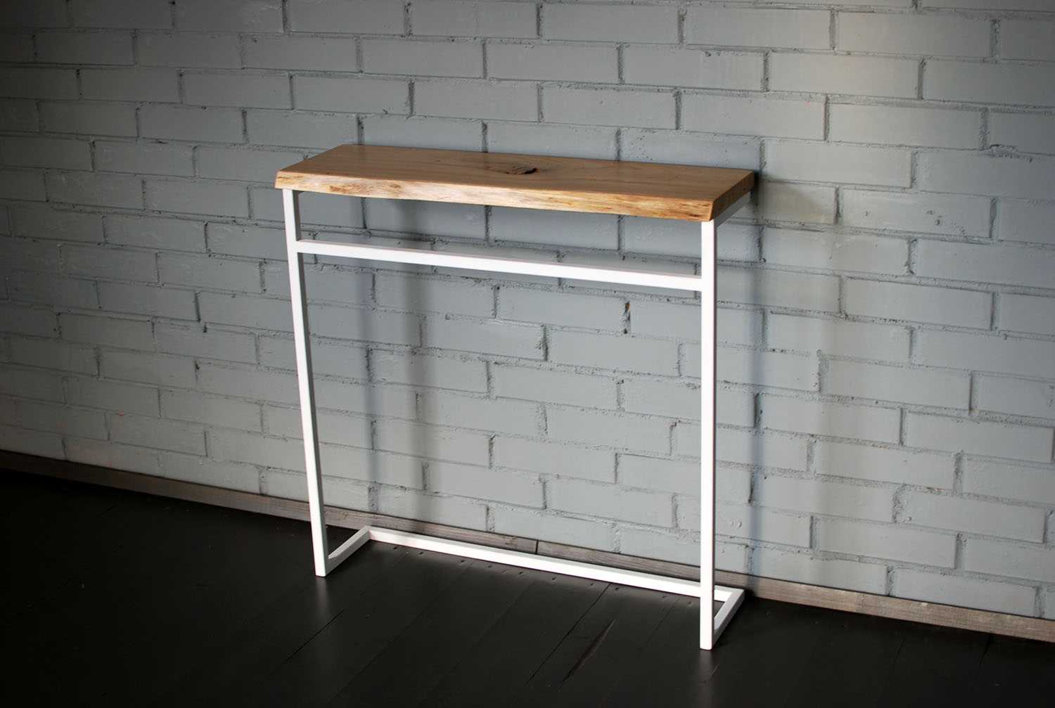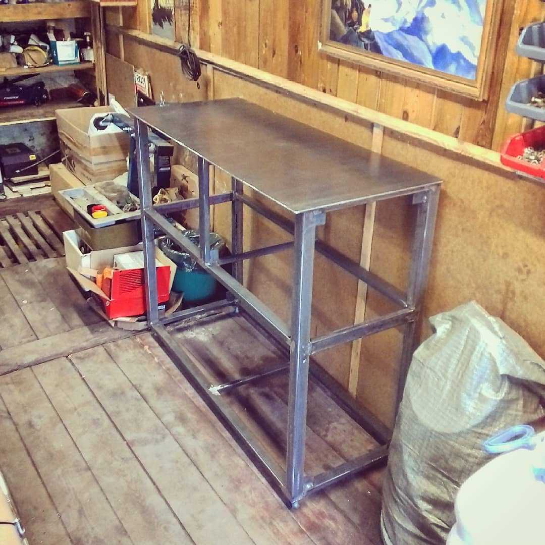 Металлическую конструкцию собирают из стальных уголков, соединенных болтами или контактной сваркой. Поверх монтируют столешницу из листа, усиленного обрезками профиля.