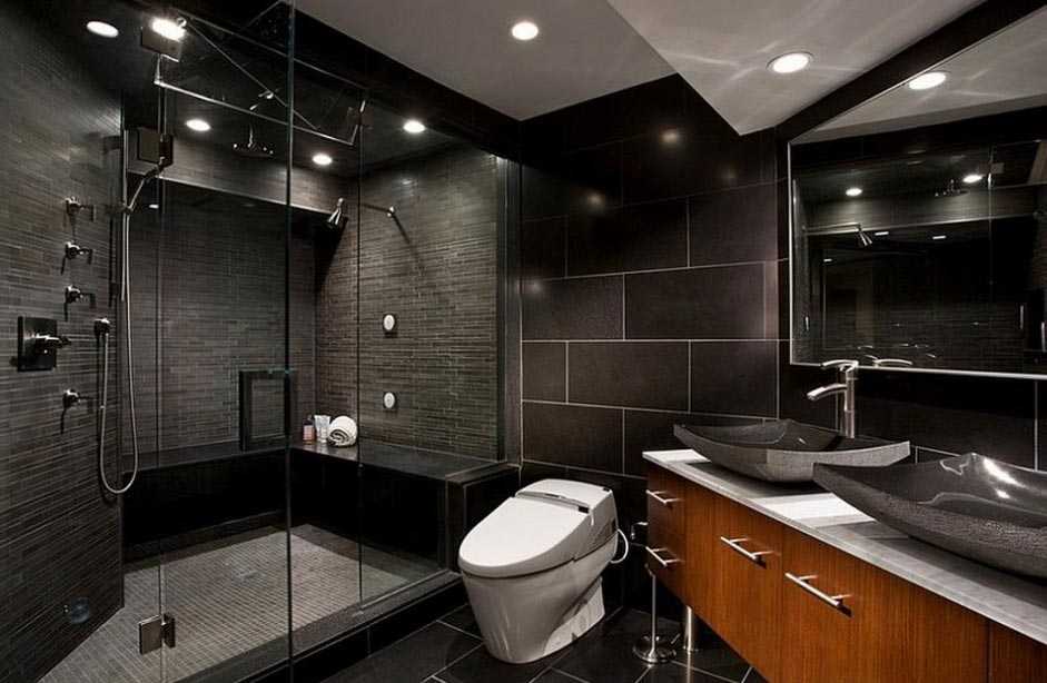 Присутствие черного цвета является удачным решением в дизайне просторной комнаты с ванной, которая будет выглядеть стильно и богато.