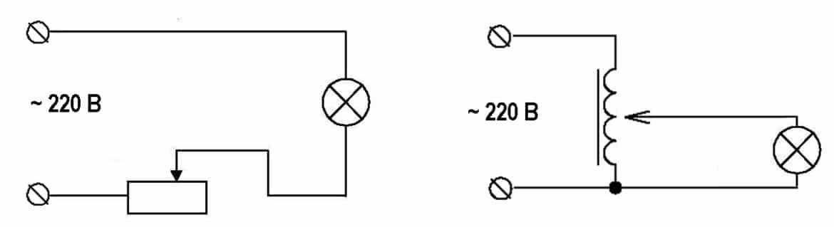 Механизмы для регулировки мощности функционируют по типу реостата. Изменение величины напряжения либо параметра тока производится в результате смены сопротивления. Простые по конструкции вариаторные устройства оборудуются поворотным регулятором, а также двумя контактными элементами. Они используются для регулировки параметра интенсивности лампочек накаливания и галогенных источников освещения.