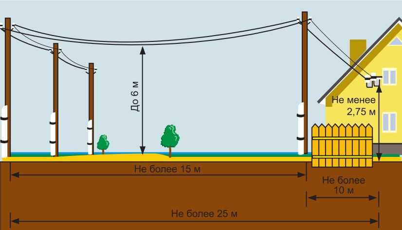 Воздушный монтаж обойдется дешевле и будет проведен быстрее, но будьте готовы в случае сильной непогоды остаться без электричества. Проведение подобных работ возможно, если расстояние до объекта не более 25 м – в противном случае придется ставить дополнительную опору, а это деньги. Для подключения используют самонесущий изолированный провод с оболочкой из сшитого полиэтилена, сечение и количество жил зависит от мощности подключения.