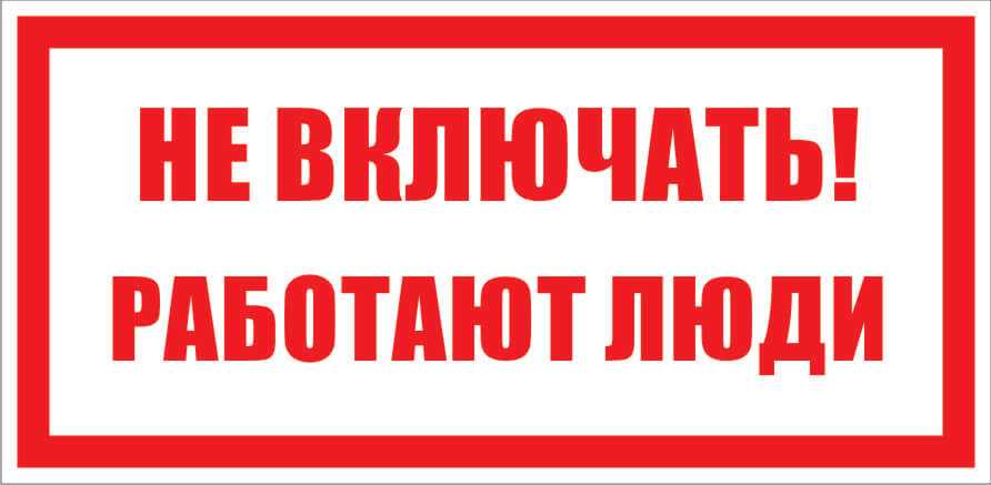 “НЕ ВКЛЮЧАТЬ. РАБОТАЮТ ЛЮДИ”: запрет на подачу напряжения к рабочему месту. Применяется в электрических установках, напряжение которых может быть как меньше, так и больше 1000 В. Размещаются такие знаки на следующих объектах:
