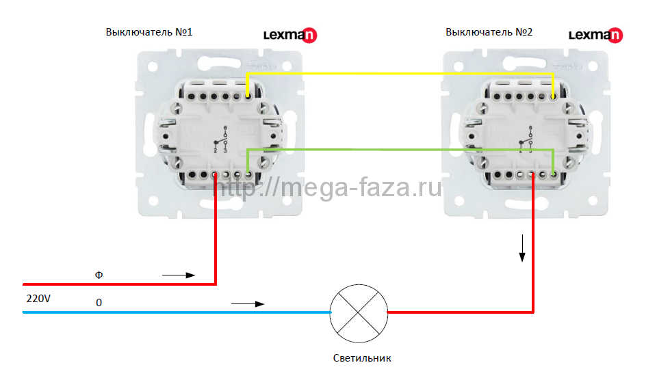 Схема подключения проходного выключателя: Подключение проводов к одноклавишным проходным выключателям выполняется следующим образом: Подключив таким образом 2 проходных выключателя можно организовать управление освещением с двух мест. Все остальные элементы — перекрестные устройства.