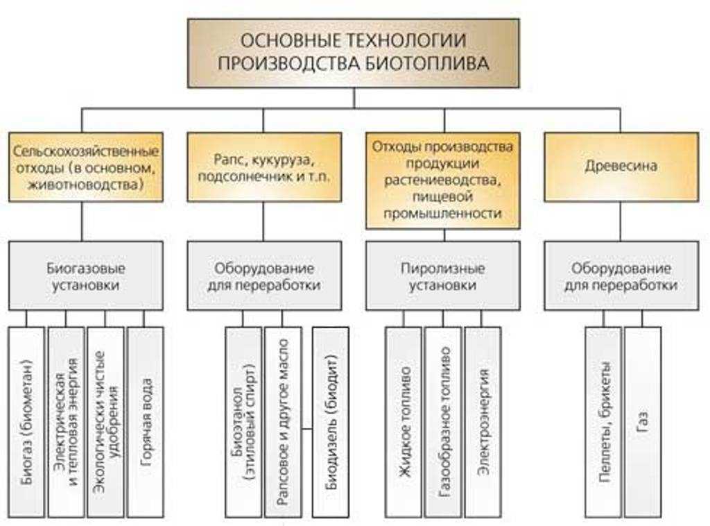 Принцип получения биотоплива основан на переработке органических продуктов с помощью специальных установок. В ходе переработки вырабатывается тепловая или электрическая энергия. Виды биотоплива могут иметь жидкое, твердое или газообразное состояние. К твердым, например, относятся топливные брикеты, жидким – биоэтанол, к газообразным – биогаз. К его разновидностям относится свалочный газ, который образуется на свалках. Использование биогаза старых свалок помогает решить проблемы переработки отходов.