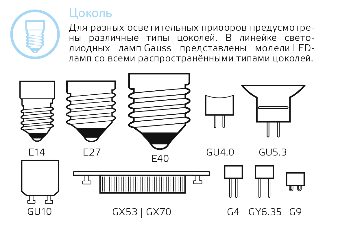 | Для встраиваемых светильников | «Gauss» | «GX» | – | GX53 | 6/8/12 |