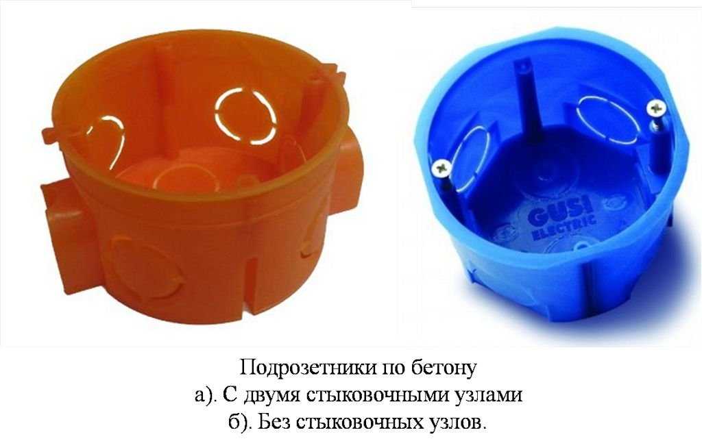 Самыми популярными являются подрозетники, изготовленные из негорючего пластика. Их можно устанавливать в бетонные стены и конструкции из композитных материалов.
