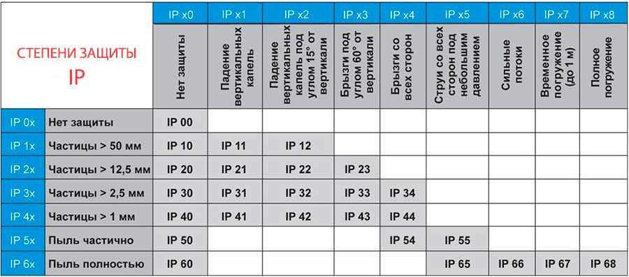 После буквенных обозначений идут цифры, которые показывают степень защиты от влаги и пыли. Ниже приведем расшифровку для каждого из видов маркировки.