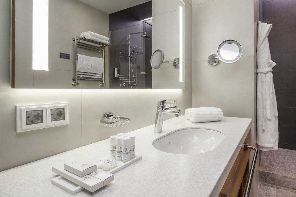 - Зона 0. Или красная зона — сюда относится внутренняя часть ванны, раковины, душевой кабины. ГОСТ запрещает размещение любых типов розеток в целях безопасности — напряжение в нулевой локации опасно для жизни.