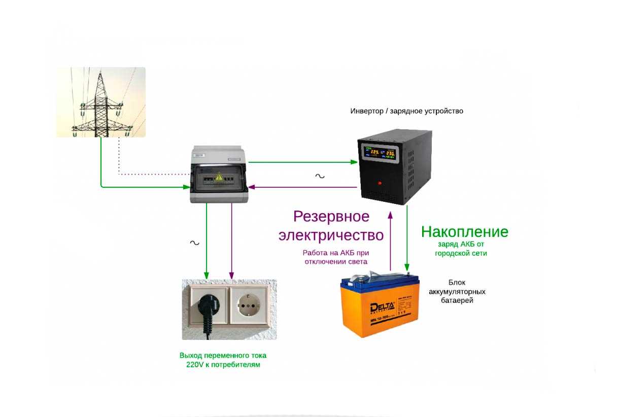 При наличии сетевого напряжения, нагрузка напрямую подключена к сети. В тот момент, когда внешнее напряжение отключается по технически причинам, плата управления подключает аккумулятор. Напряжение 12 или 24 вольта поступает на преобразователь, где оно конвертируется в переменное напряжение 220 В.