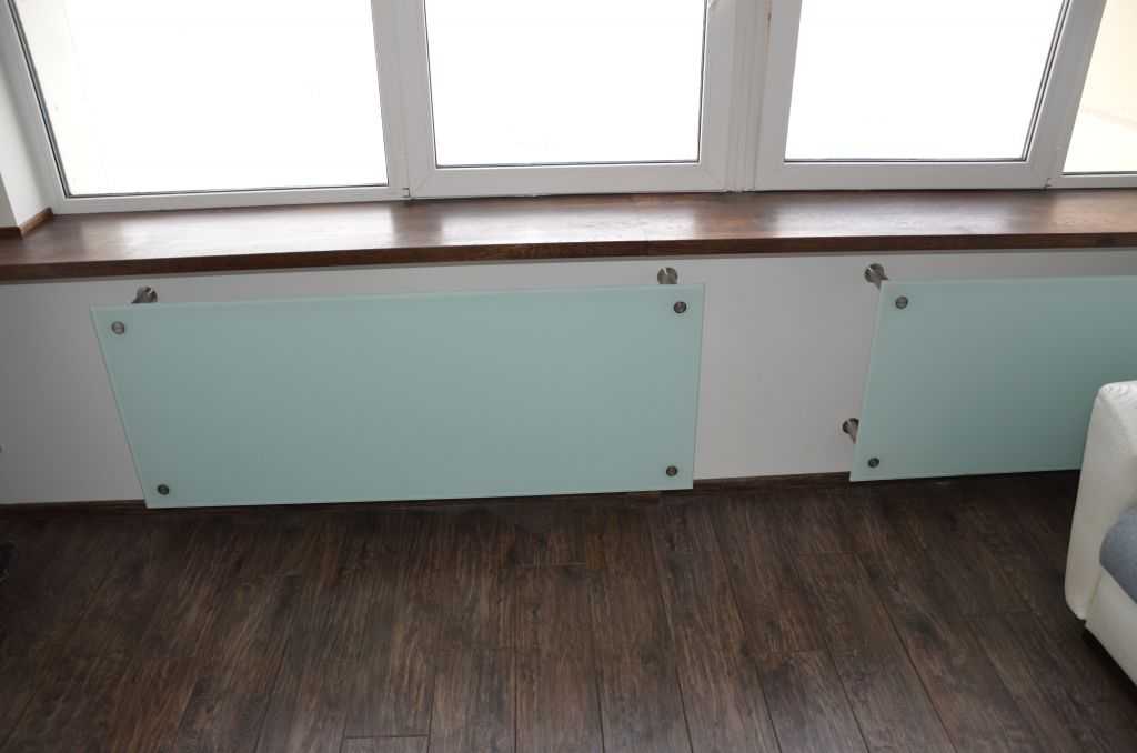 Со стеклянными экранами действует то же правило, что и с навесными металлическими: он должен гармонично вписываться в пространство под окном, поэтому желательно выбирать стекло шириной, равной ширине подоконника. Если выделить стеклом только часть пространства под подоконником, где расположена батарея, получится эффект, обратный ожидаемому.
