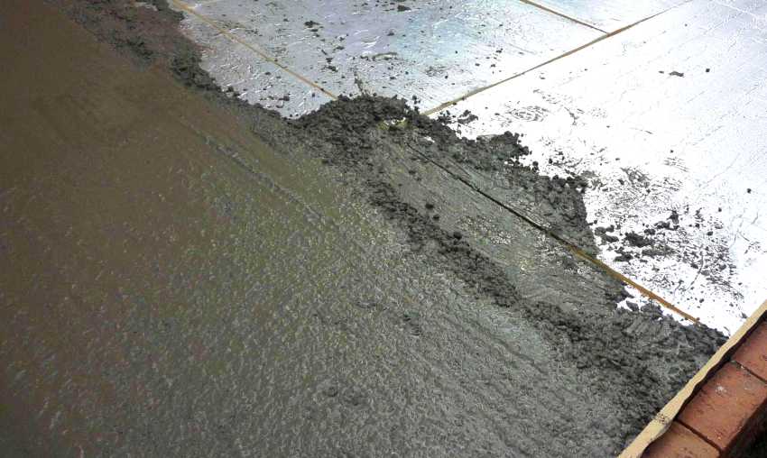 В дальнейшем заново заливают цементно-песчаной смесью подвижный участок стяжки, выравнивают широким шпателем раствор вровень с полом.