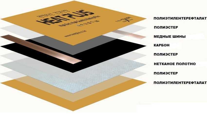 Конструкция изделия существенно отличается. Основа нагревательного элемента – по-прежнему карбон или смесь карбона и графита. Состав напыляют на основу из термостойкого полипропилена, формируя токопроводящие дорожки. Основу закрывают с двух сторон двух- или трехслойной пленкой и запаивают. Материал выдерживает нагрев до 120 С, не боится воды или влаги. Ширина полосы – 50–100 см. Между собой они соединяются медными шинами.