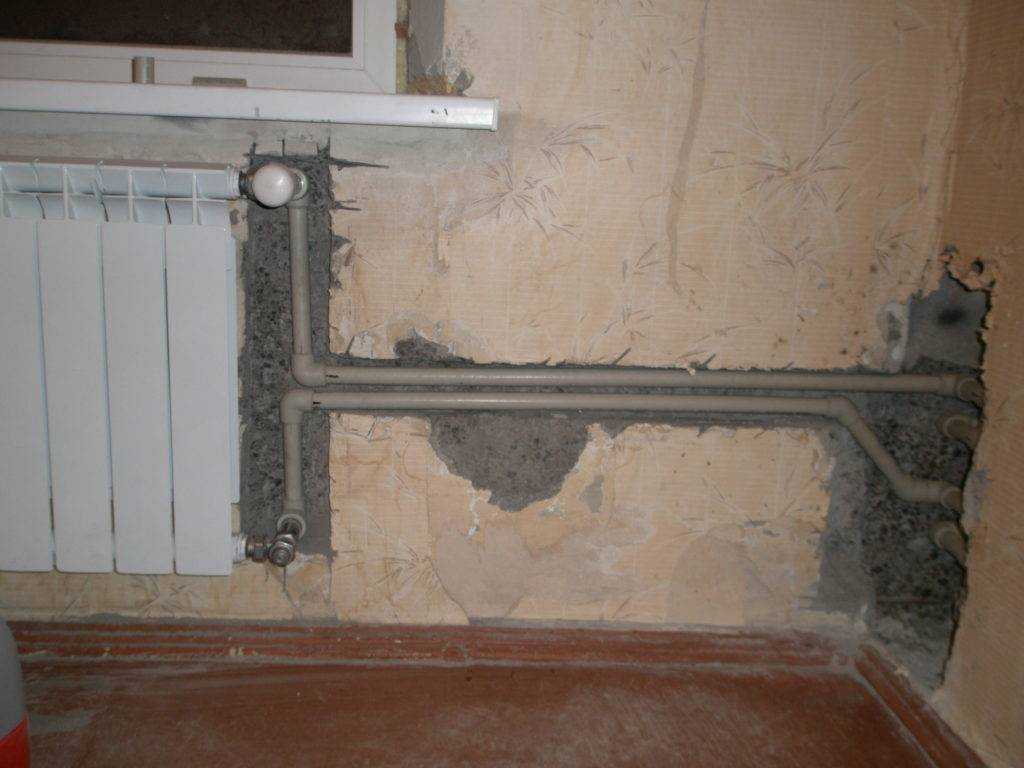Трубы можно спрятать внутри стен или пола. Это очень удобно и эстетично. Для прокладки магистрали делают штробу, трубы оборачивают теплоизоляционным материалом и укладывают в выемку в стене, потом заделывают ее или зашивают гипроком.