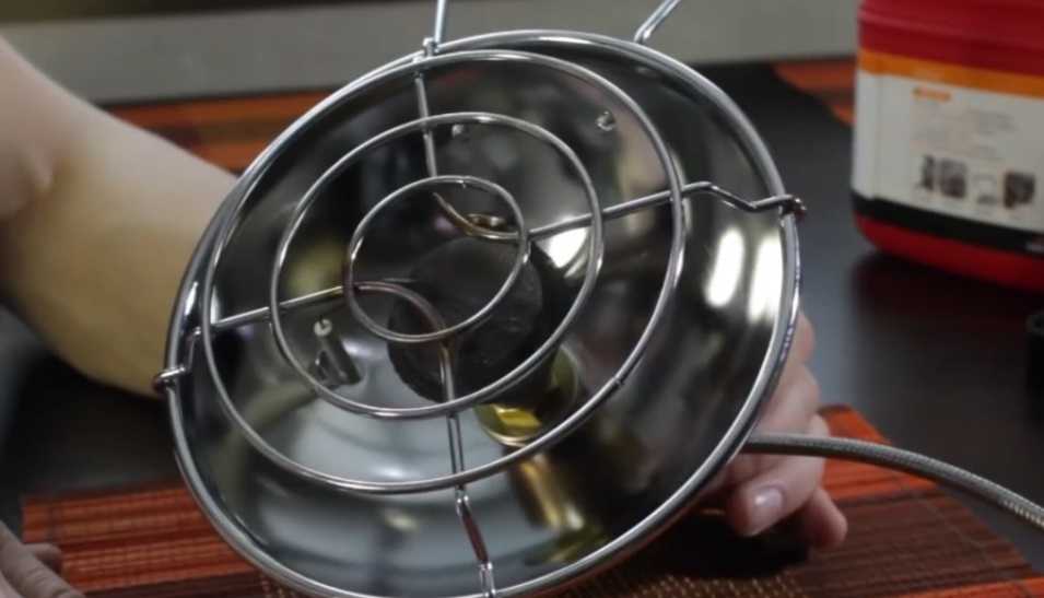 Вся регулировка производится вентилем на баллоне. 27 литров голубого топлива хватит на 47 часов непрерывной работы. Устройство занимает немного места, потому что максимальная длина корпуса составляет 250 мм. У обогревателя нет никаких датчиков и защитных механизмов, поэтому нужно быть внимательным и не допустить возгорания или утечки газа при потухшем огне.