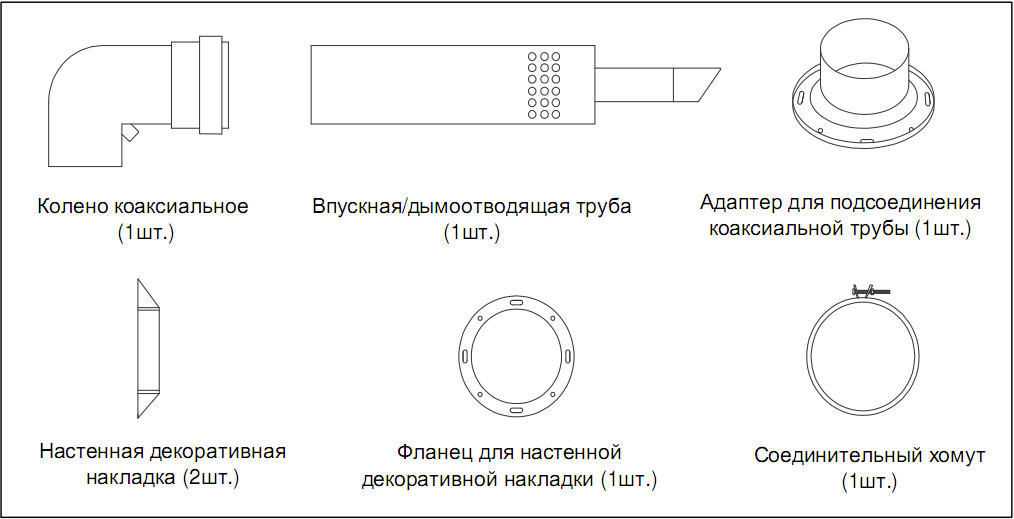 В комплекте коаксиального дымохода содержится всё необходимое для его установки