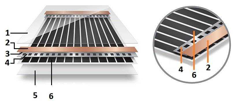 Инфракрасная пленка, которой оснащены полы такого вида, представляет собой изоляционную крайне тонкую пленку до 1 мм, в которой внутри размещен электропроводный материал.