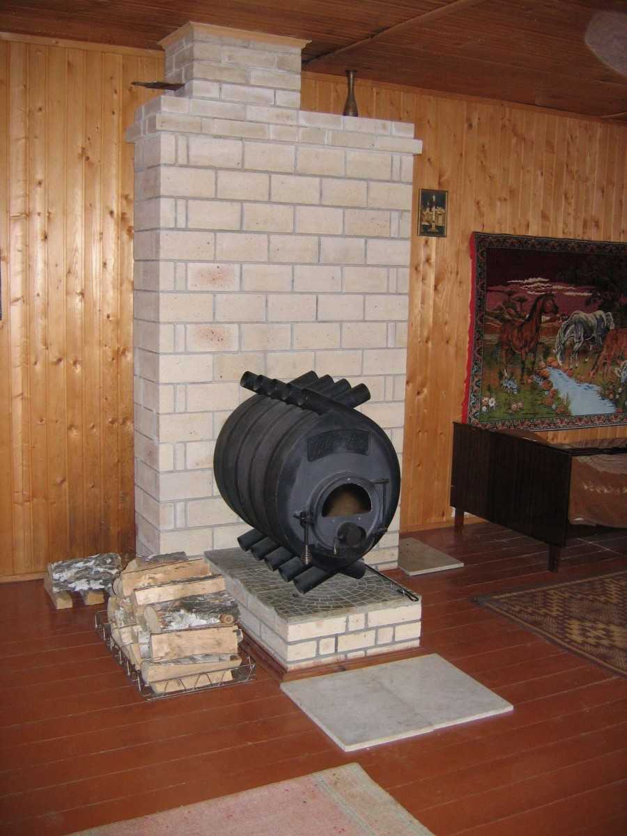 Самодельный буллер, ввиду своей неказистости, даже в самый скромный интерьер вписывается довольно плохо. Между тем сделать эту печь по-настоящему привлекательной можно при помощи очень простого приёма — обложив её камнем или кирпичом.