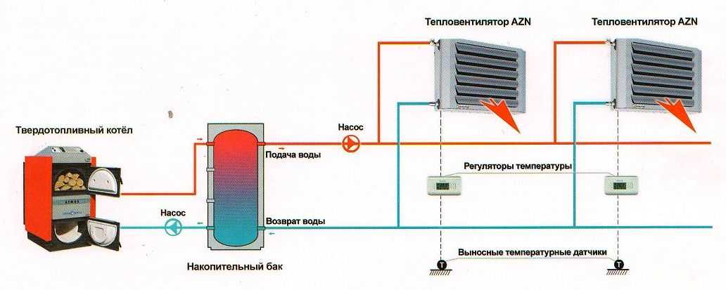 Принцип прямоточной доставки нагретого воздуха зачастую используется в самадельной конструкции. Воздух, нагнетаемый вентилятором, проходит через нагреватель. Прогретые массы воздуха заходят в теплопроводы и проникают внутрь помещений. Обратно охлаждённая масса теплоносителя покидает дом через шахту в атмосферу.