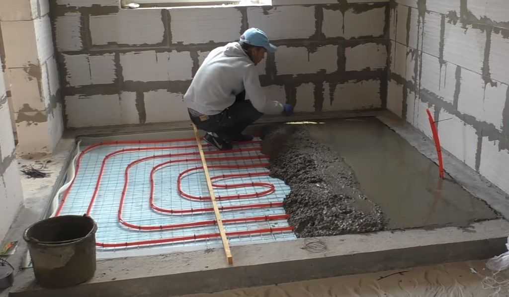 - Бетон на основе мелкозернистого наполнителя применяется в системах водяного пола. Плита получается прочная и не растрескивается.